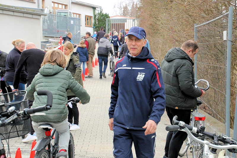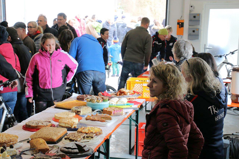 Aufgrund der zahlreichen Radanlieferungen und dem damit verbundenen Platzproblem wurde kurzerhand die „Futterzone“ umquartiert. Es hätten keine 10 Räder mehr sein dürfen, sonst hätten wir logistische- und Platzprobleme bekommen. Dieses Mal war alles dabei, vom Laufrad bis zum Senioren-E-Bike. Schon ab 12.30 Uhr staute sich die Schlange der Kaufinteressierten bis weit vor den Halleneingang, sodass wir 5 Minuten vor eigentlichem Verkaufsbeginn die Schleusen öffneten. Etwa 2/3 der angelieferten Räder wechselten den Besitzer, sodass durch die „Einstellgebühr“ von 1 Euro, den 10% Verkaufsprovision und dem Erlös von Kaffee- und Kuchenverkauf ein ordentlicher Beitrag für die Jugendkasse des Tri-Teams zusammen kamen.